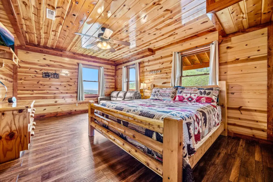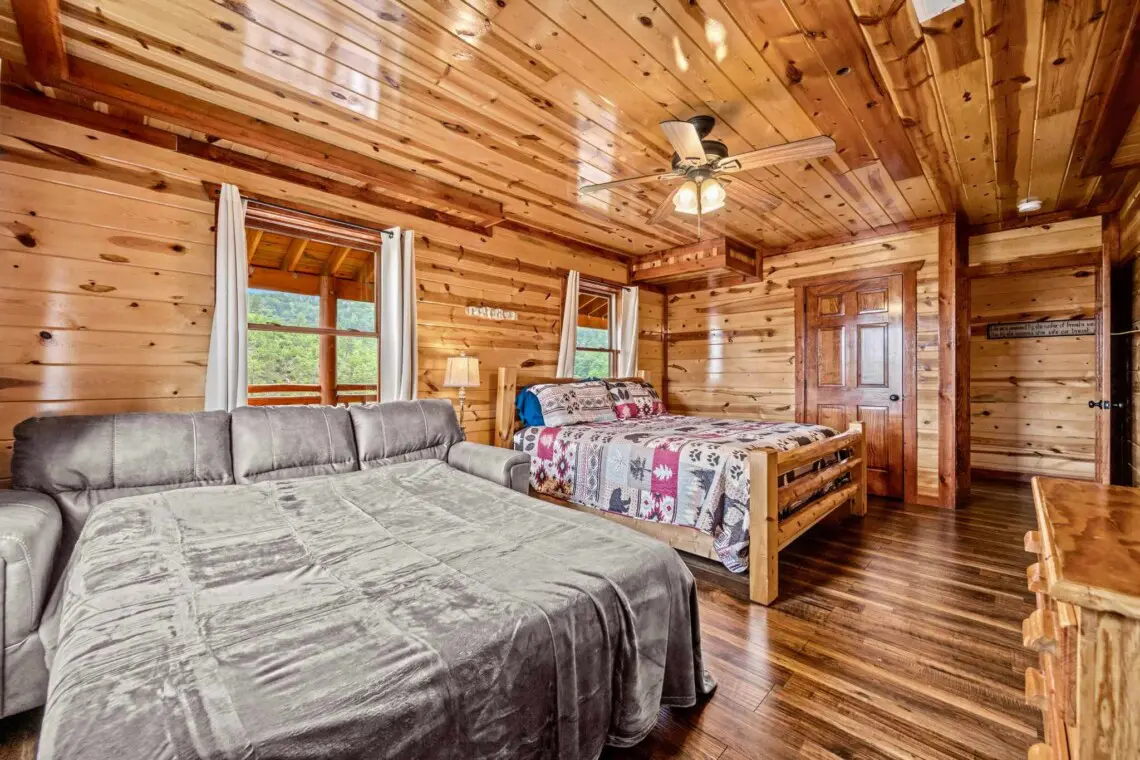 The cabin comfortably sleeps 16, with room for up to 20 using sleeper sofas — perfect for multi-family vacations, wedding groups, or holiday gatherings.