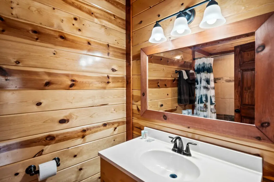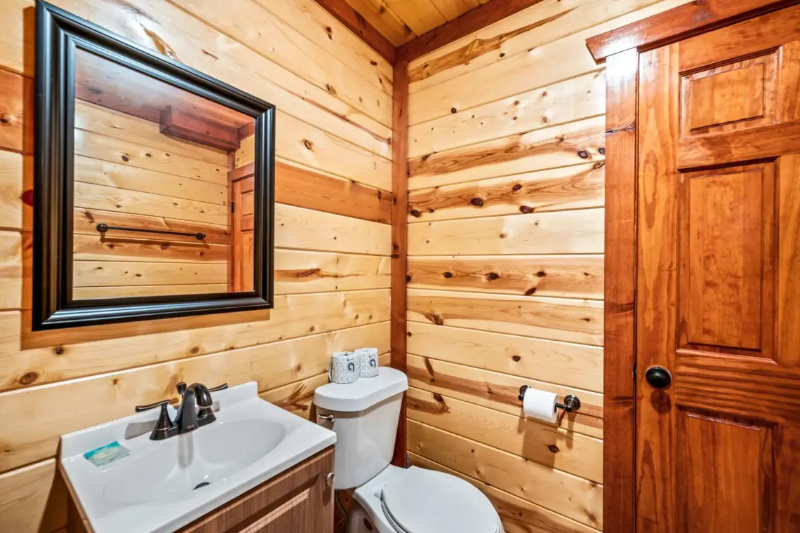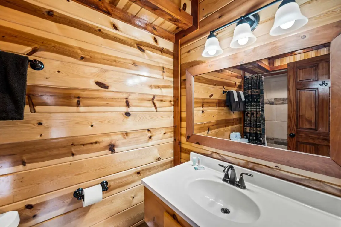 The bathrooms are thoughtfully designed with showers, modern vanities, and starter toiletries. Plus, there’s a convenient half bath by the pool, so you won’t need to trek across the cabin while swimming.