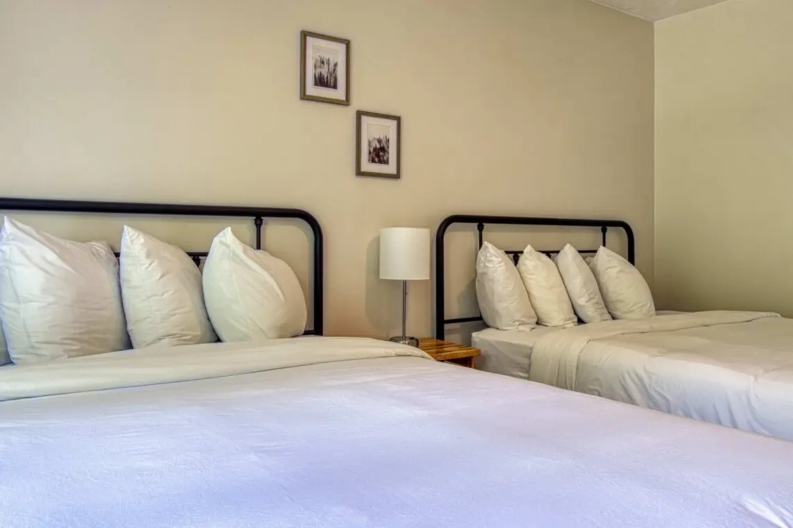 Upstairs, you’ll find two beautiful bedrooms that offer privacy and tranquility after a day of adventure. The primary bedroom features a king-sized bed, soft linens, and calming mountain tones, your own personal retreat to rest and recharge. The second bedroom offers two queen beds, perfect for families or friends traveling together.