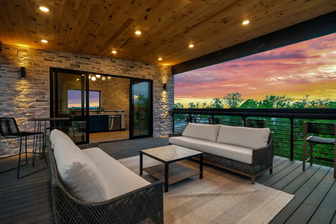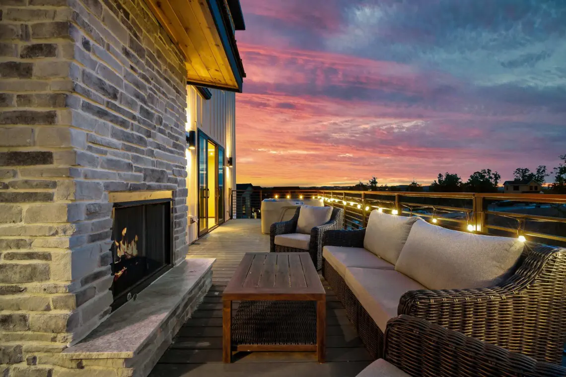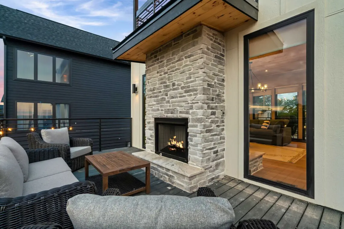 ☀️ Outdoor fireplace, a mini bar, and multiple decks with outdoor seating