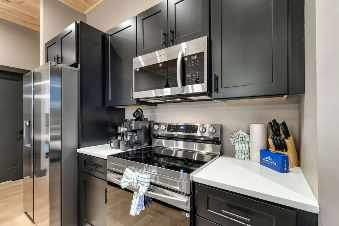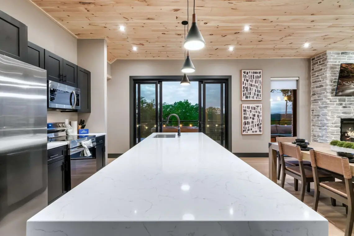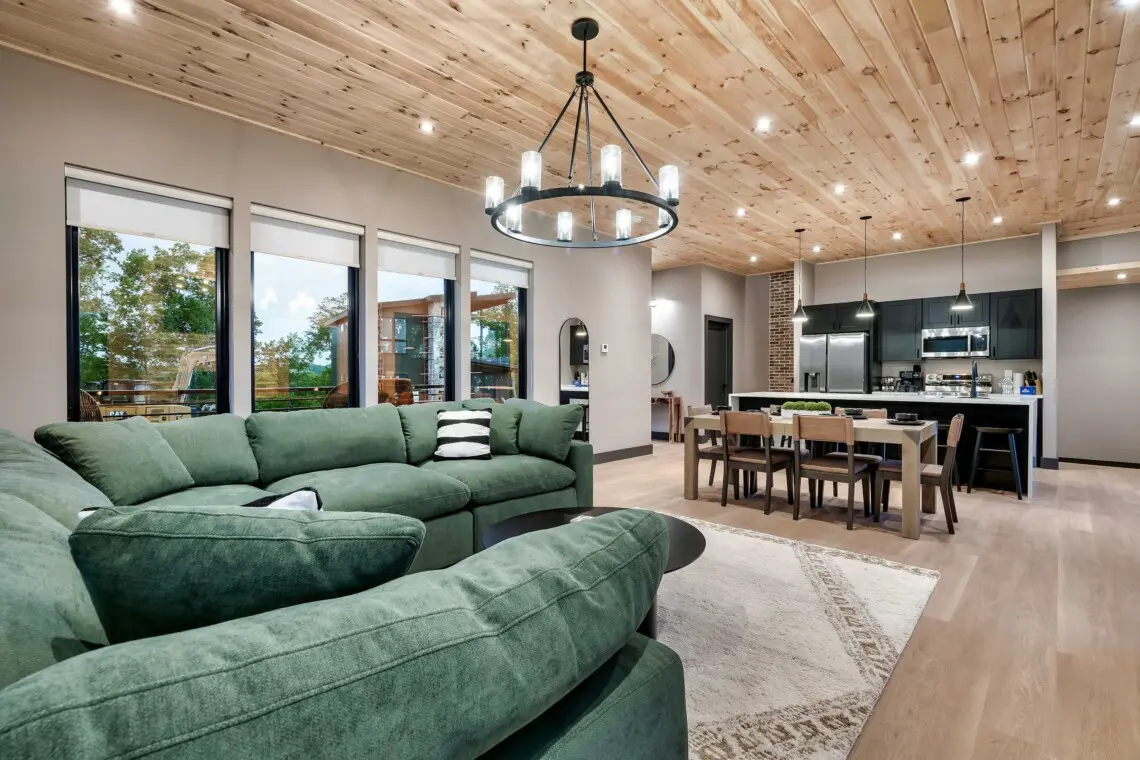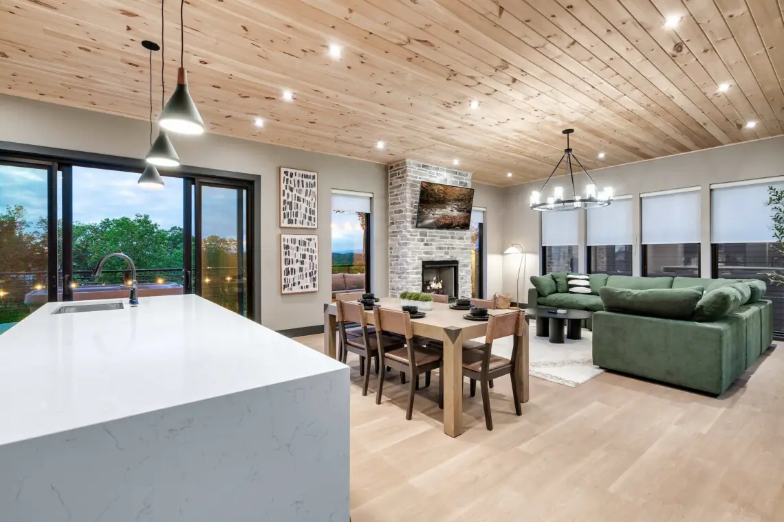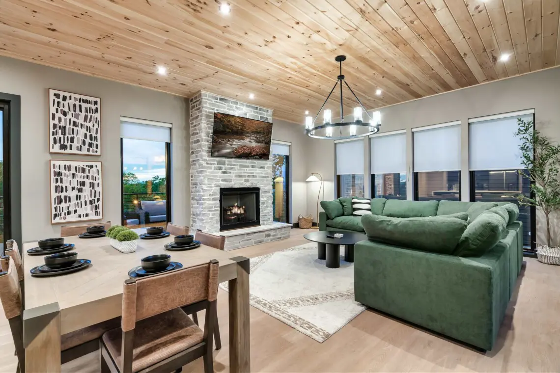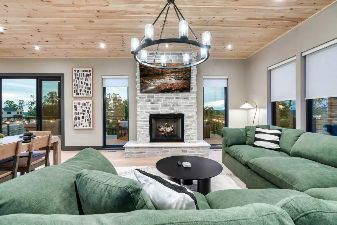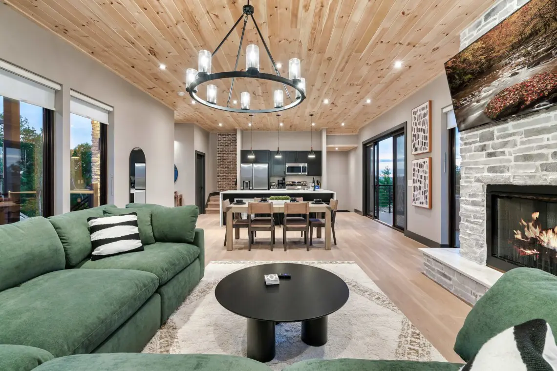 Inside, you’ll be welcomed by an open-concept living space where modern design meets rustic charm. Soaring ceilings, a cozy stone fireplace, and plush seating create the perfect ambiance for curling up with a book, enjoying movie nights, or spending quality time with loved ones.
