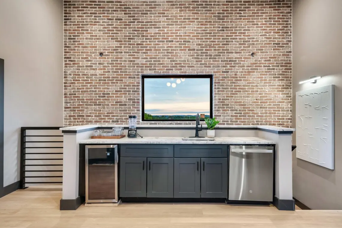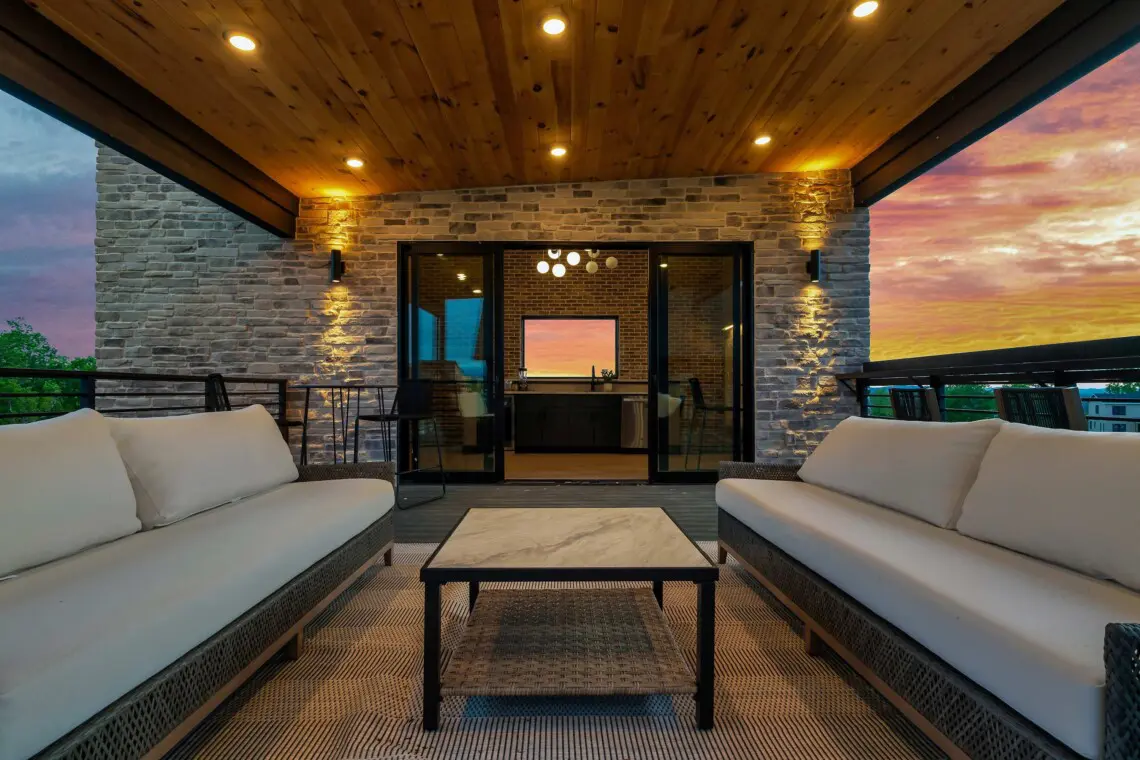 On the upper level, a show-stopping entry to a unique rooftop deck designed for entertaining. This one-of-a-kind space features a mini bar with mini fridge, ample lounge seating, a modern outdoor fireplace, an outdoor dining island, and even an outdoor TV—perfect for game day or movie night under the stars.