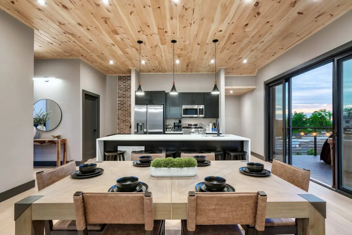 The fully equipped kitchen is a dream for food lovers and entertainers alike. Featuring high-end appliances, a spacious island with seating, and a stunning wooden ceiling, this kitchen is built for everything from casual breakfasts to gourmet dinners. Whether you’re sipping coffee at sunrise or sharing stories over a late-night snack, this space is the heart of the home.