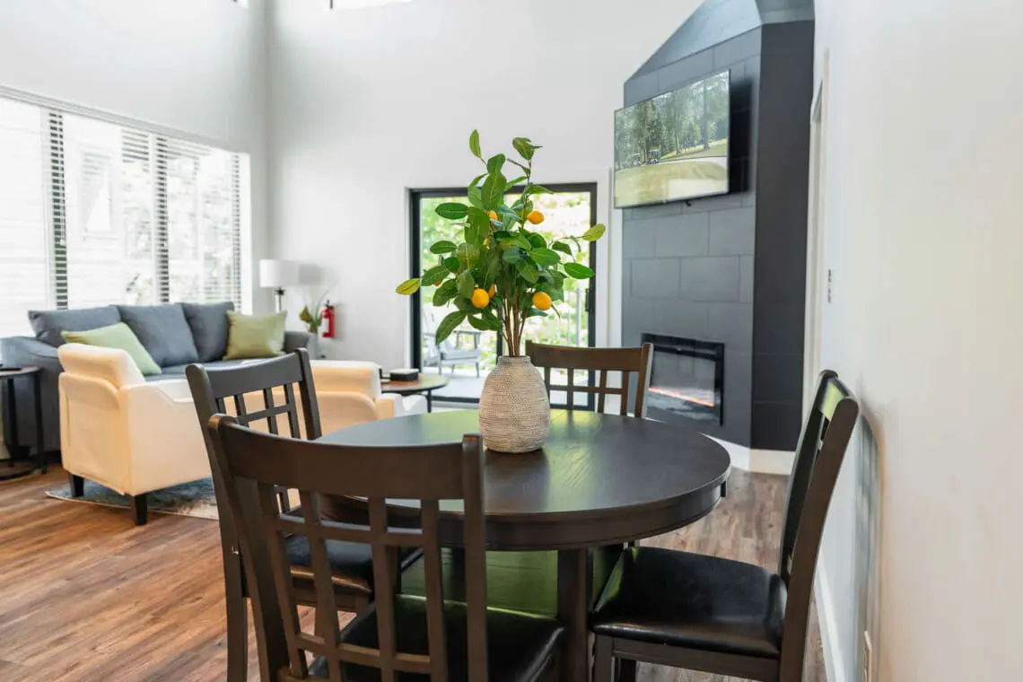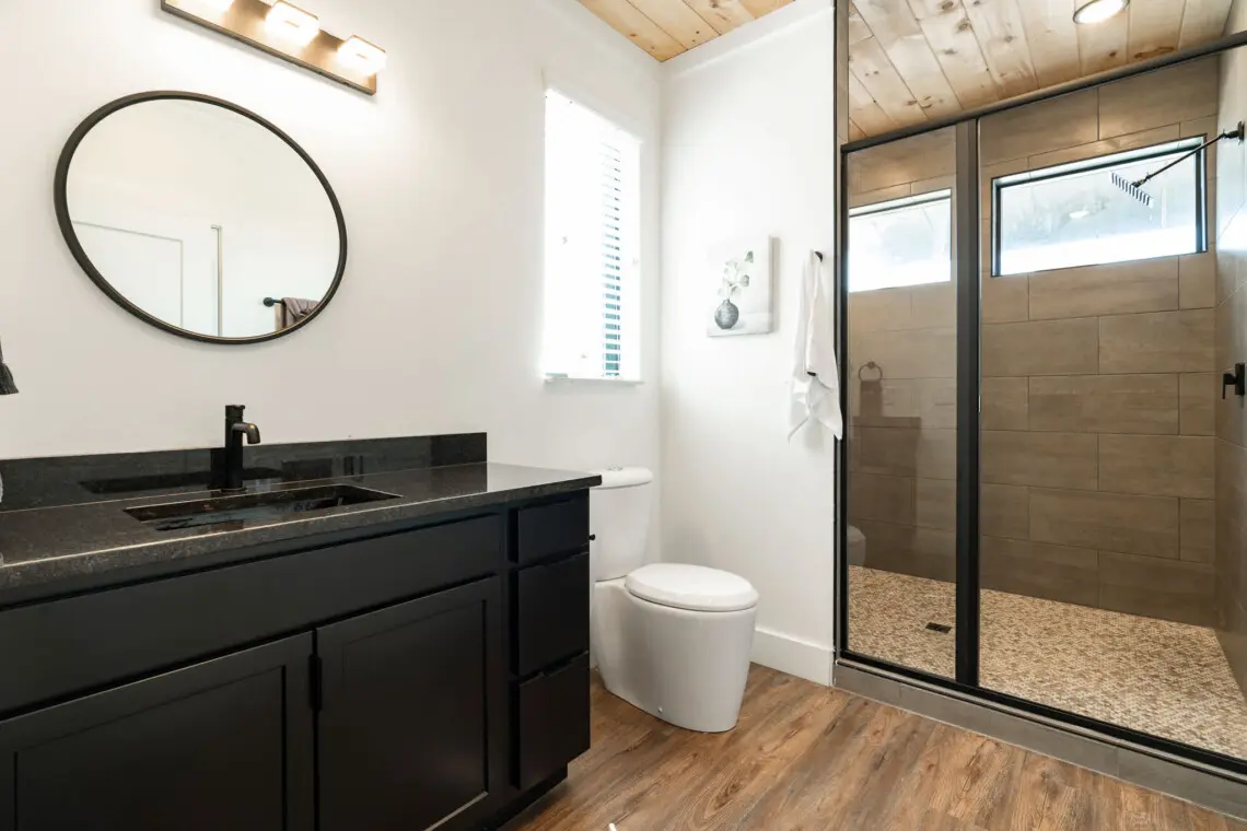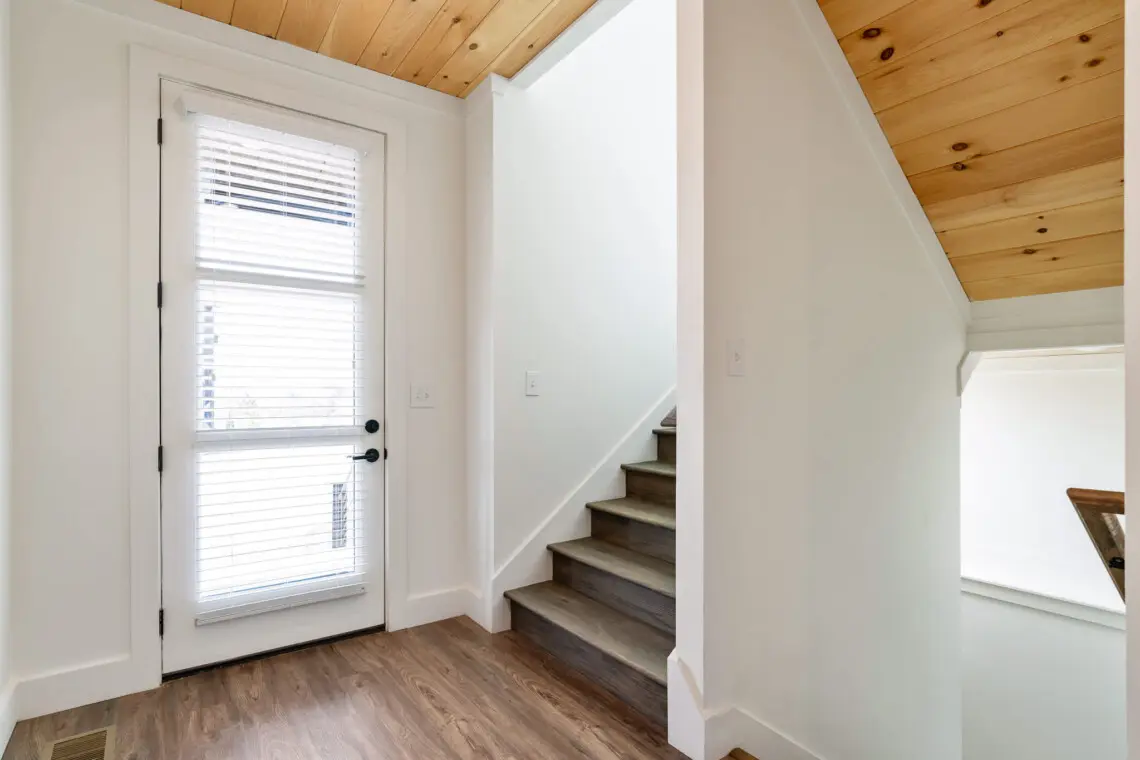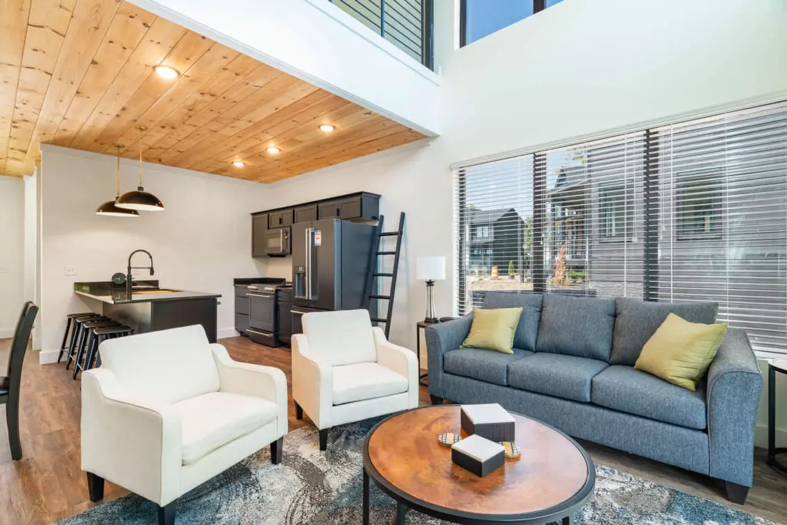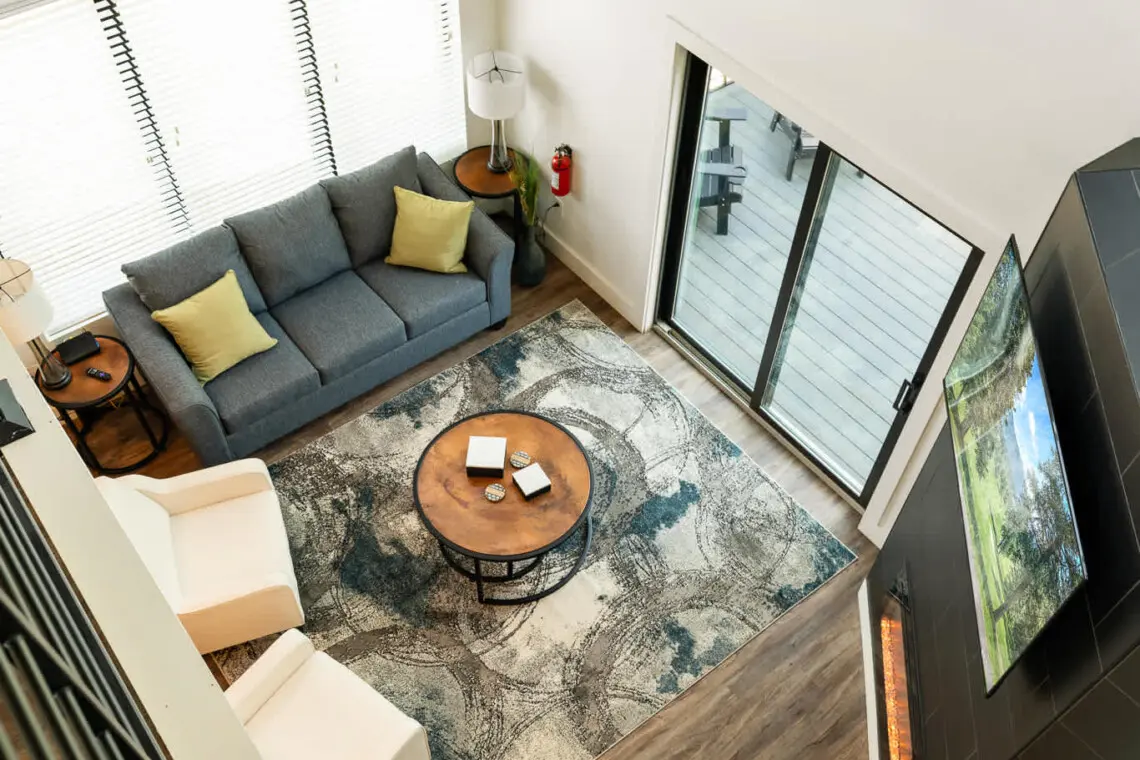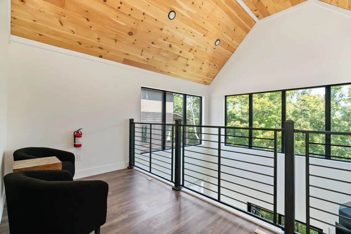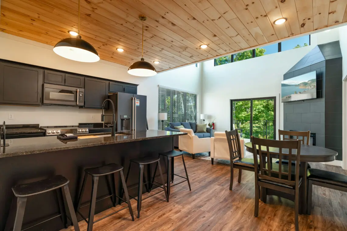 Experience luxury in our modern apartment, boasting large windows that fill the space with natural light. Upon arrival, use the house numbers to find your cabin and enjoy convenient parking for 2-3 cars right at your doorstep. A few steps up, enter with your personal code, and you’re home!