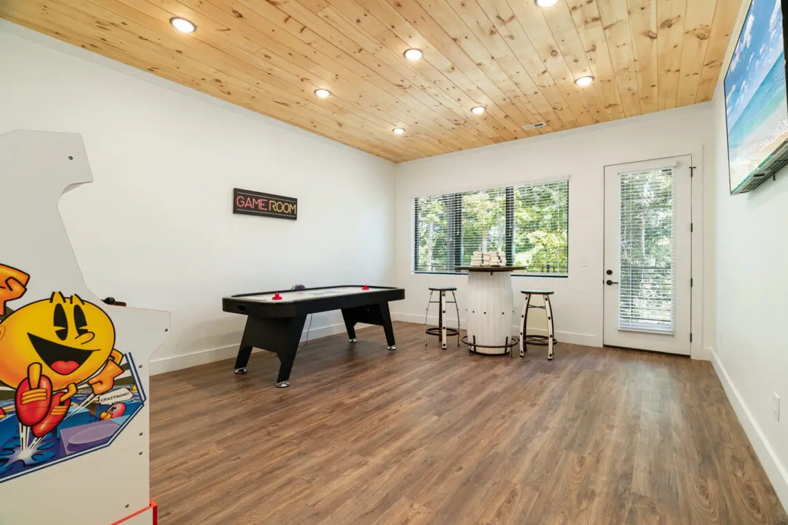 Discover southern charm in our cozy cabin, offering spacious living and easy access to local attractions. Step inside to experience a contemporary atmosphere designed for relaxation and comfort. The open kitchen and living area provide a welcoming space, whether you’re preparing a family meal or enjoying a late-night snack with friends. And, enjoy family games in the game area.