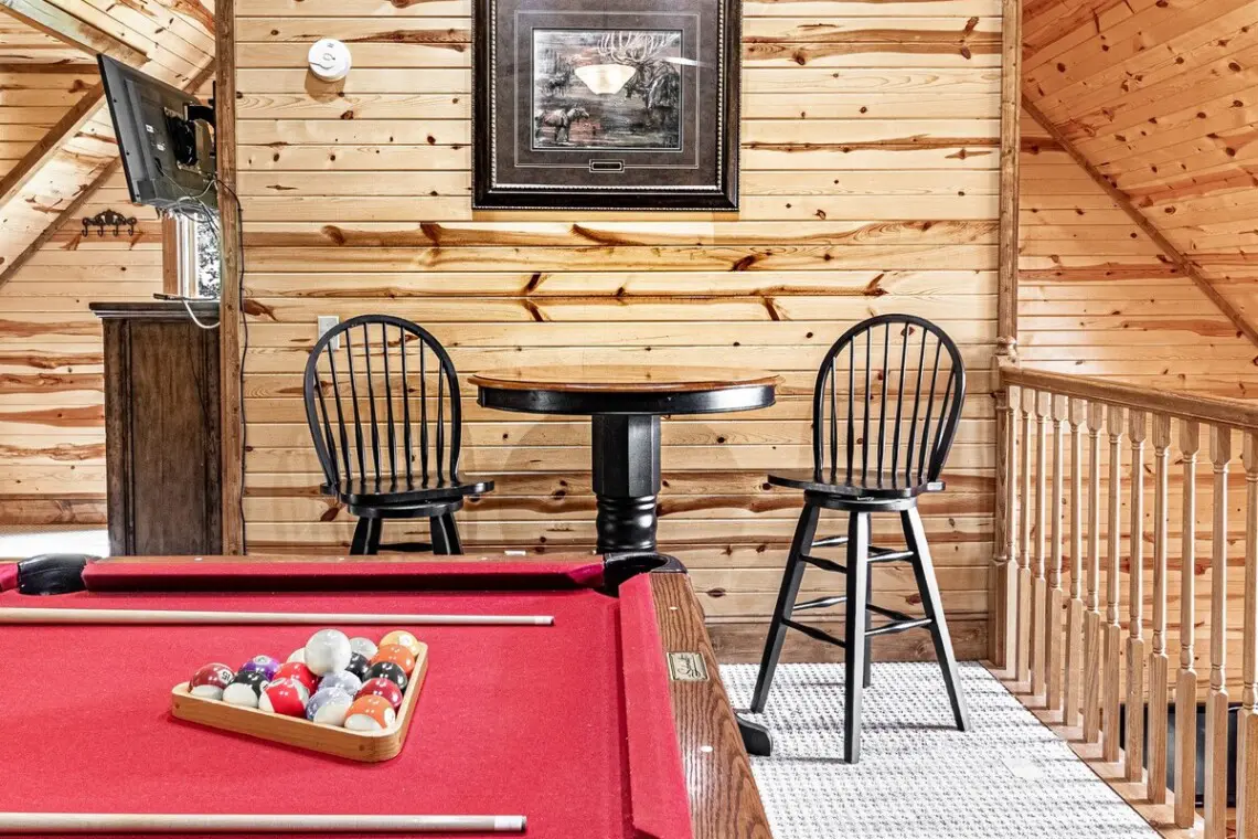 Step inside and feel your shoulders drop. The cabin’s open living space invites you to unwind by the crackling fireplace, challenge friends to a game of pool, or curl up with a blanket and a movie after a day of mountain adventures.